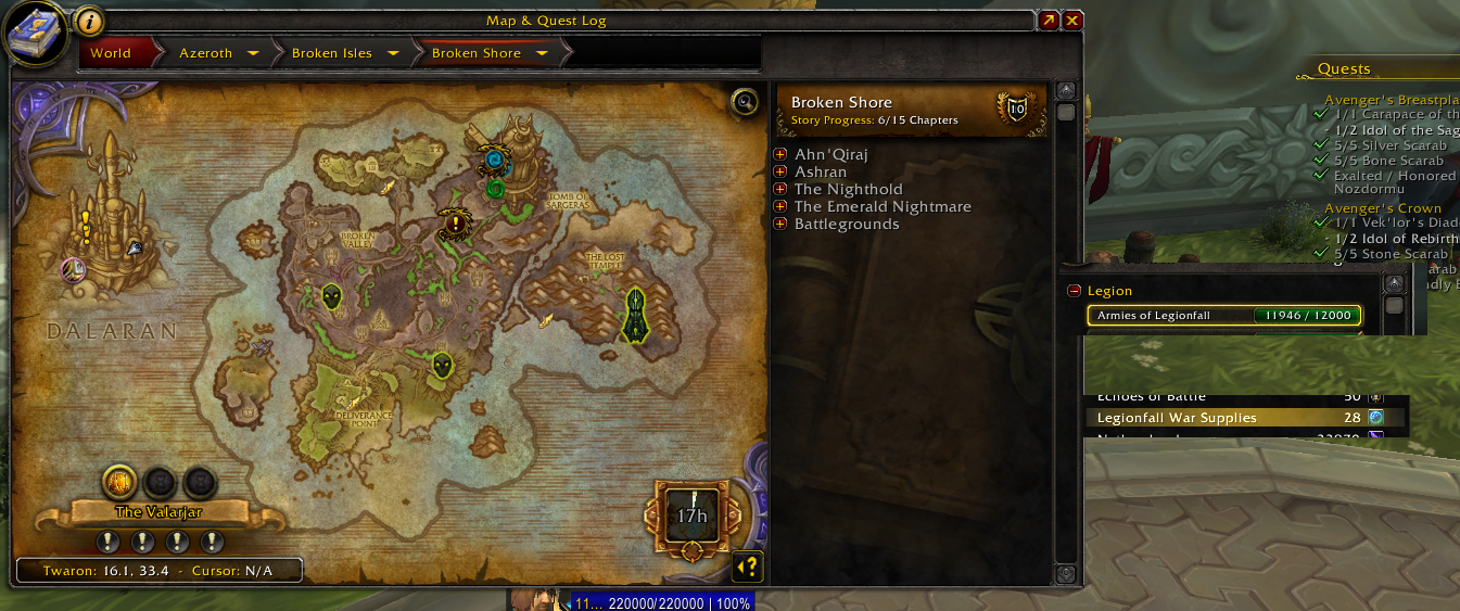 Und nein, die Elite-Q is buggy, vermutlich weil der Worldboss da is. Also man sieht sie, solange man nich auf der Broken Shore is, aber sie verschwindet wenn man es ist und man bekommt sie auch nich wenn man hinreitet. Also entweder "farm" ich 72 Legionsupplies, oder mach den Dungeon oder warte bis morgen. Hmmmm...